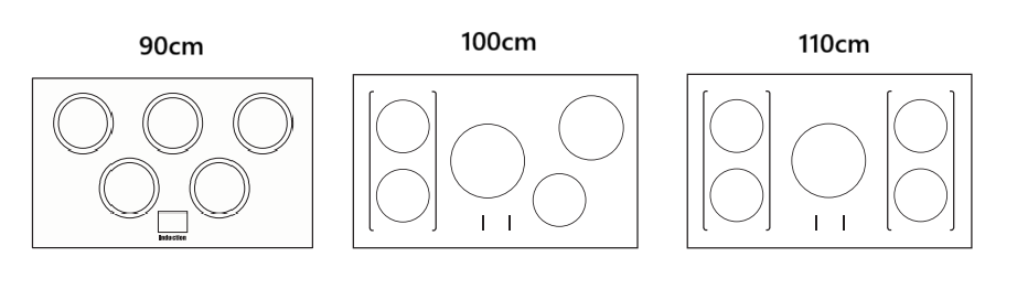 The 90cm and 100cm models have a multifunction fan oven, grill, and extra fan oven on the right hand side, while the 110cm model has a grill, a multifunction fan oven on the left, a fan oven on the right, and a slow cooking oven on the top right. All sizes come with a choice of induction or gas hob.